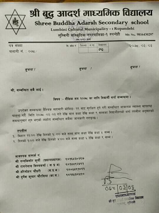 सूचना अनुसार भाेलि १ दिन बाल विकास देखि कक्षा १२ सम्म विदा रहने जानकारी गराइन्छ । बुद्ध आदर्श विद्यालय 2025-11-15 08:17:06 |